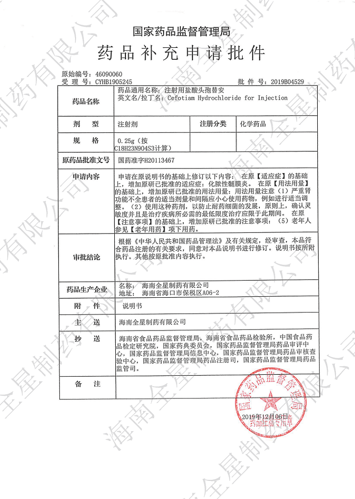 經(jīng)過(guò)公司研發(fā)團(tuán)隊(duì)長(zhǎng)期循證醫(yī)學(xué)研究,并結(jié)合上市原研藥品使用說(shuō)明書,我公司向國(guó)家藥品監(jiān)督管理局提交的注射用奧美拉唑鈉、注射用鹽酸頭孢替安(4種規(guī)格)和注射用頭孢呋辛鈉(3種規(guī)格)適應(yīng)癥的補(bǔ)充申請(qǐng)近日獲得批準(zhǔn),新核準(zhǔn)的藥品使用說(shuō)明書拓展了臨時(shí)用藥范圍,用法用量描述更詳細(xì)更為安全,提供了更加嚴(yán)謹(jǐn)?shù)挠盟幰罁?jù),有助于臨床醫(yī)生在一線工作中制定出更準(zhǔn)確、更有效、更有針對(duì)性的治療方案。今后,公司將繼續(xù)提高研發(fā)力量,加強(qiáng)技術(shù)生產(chǎn)工藝,嚴(yán)把質(zhì)量關(guān)口,為市場(chǎng)提供更多高品質(zhì)、高標(biāo)準(zhǔn)的優(yōu)質(zhì)產(chǎn)品,為2030年健康夢(mèng)中國(guó)夢(mèng)添磚加瓦,獻(xiàn)上我司的一份努力。